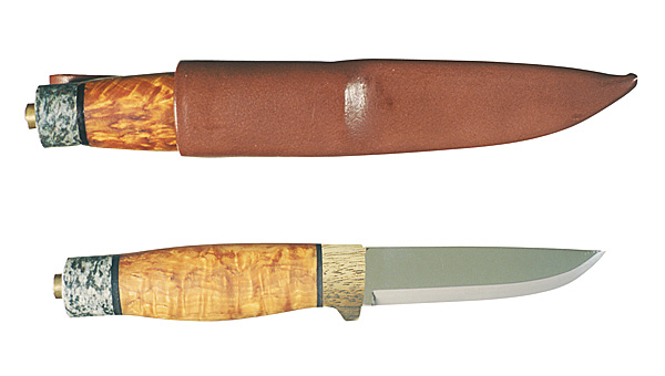 Bestellung@outdoorspezi.de ArtNr.: 167109 Helle Nr. 89G "Kvernstein" Klinge 9cm. Griffkombination aus Rentierhorn, masurischer Birke, Leder und Mühlstein.