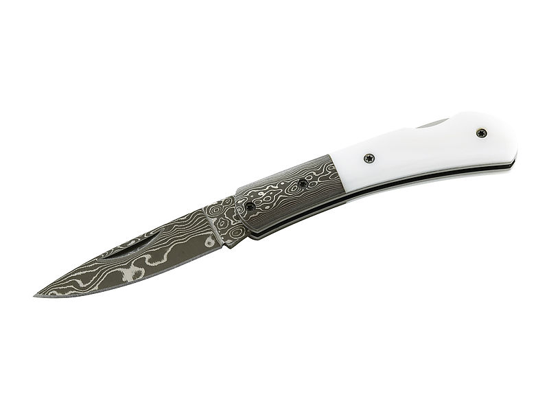 Damaszenerstahl, Kern 440C Griffschalen aus weißer Süsswassermuschel,