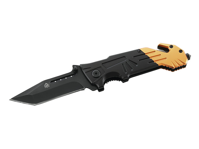 Dank der beidseitigen Daumenpins ist dieses Einhand-Rettungsmesser aus der Puma TEC Serie blitzschnell einsatzbereit. Ein Liner Lock System sorgt für die sichere Arretierung der schwarz beschichteten Tanto-Klinge aus rostfreiem AISI 420 Stahl. Die orange-schwarzen Griffschalen aus Aluminium liegen aufgrund des Griffdesigns gut in der Hand. Gurtschneider, Glasbrecher und Gürtelclip runden die Ausstattung dieses Messers ab Preis 22,00 € Jetzt gleich bestellen bei: