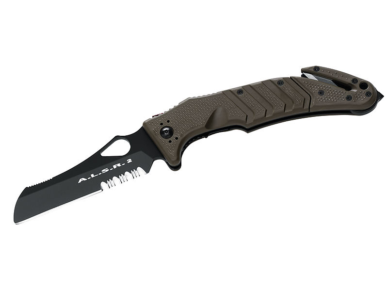 Die schwarze, beschichtete Klinge und NATO-grüne Heftschalen aus Forprene-Kunststoff geben dieser Ausführung des Rettungsmessers A.L.S.R. 2 einen militärischen Look. Nicht verwunderlich daher, dass das Messer Teil der Fox-Reihe Military Division ist. Als Klingenmaterial wird rostfreier Stahl N690Co verwendet. Die Bedienung erfolgt über einen Klingendurchbruch und Liner Lock. Zur Ausstattung gehören Teilsägezahnung, Gurtschneider und Scheibenzertrümmerer. Ebenso inklusive sind Gürtelclip und ein stabiles Nylon-Etui. Preis 116,20 € Jetzt gleich bestellen bei: